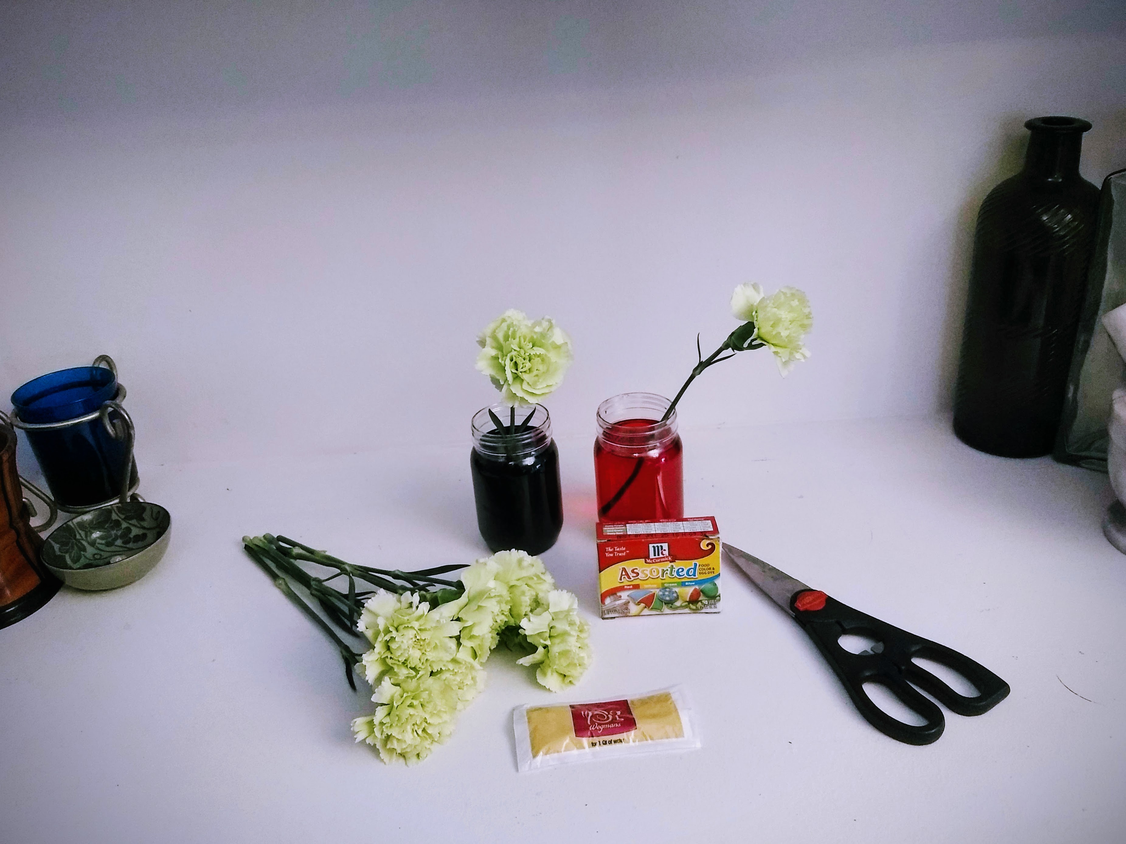 Using less food dye or cold water may make for less bright flowers. Using a nonwhite flower will produce a different result. The brand and color choice of your dyes will produce different results, with red generally being more effective than blue, which is more effective than green.