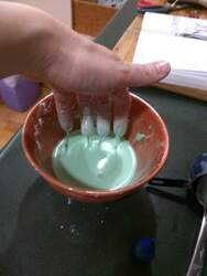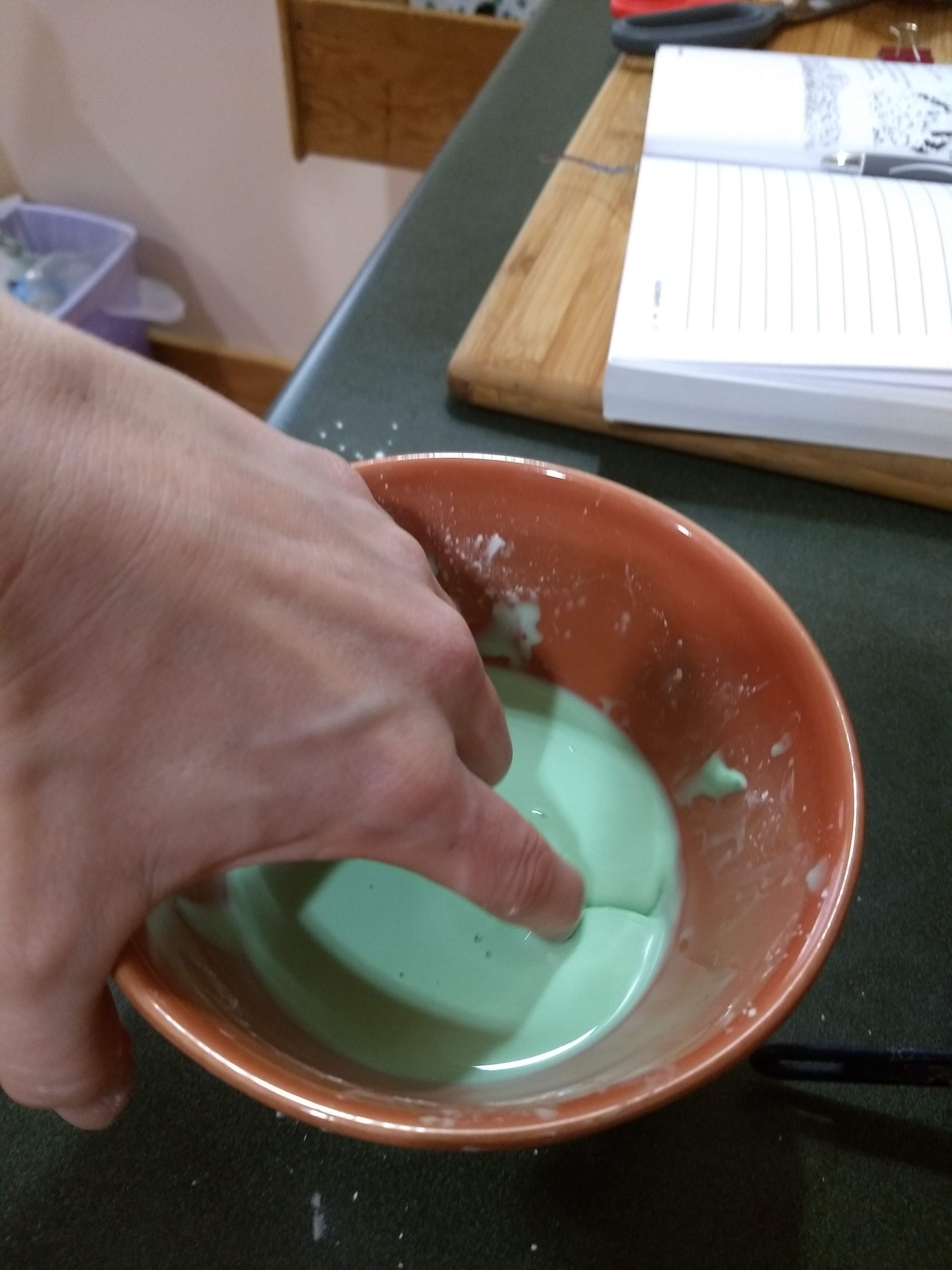 Your mixture should act like a liquid: it will run through your fingers and pour or drip into a bowl and you can submerge your hand in it. Your mixture should act like a solid: push on it firmly with your fingers or quickly smack it with the back of a spoon.