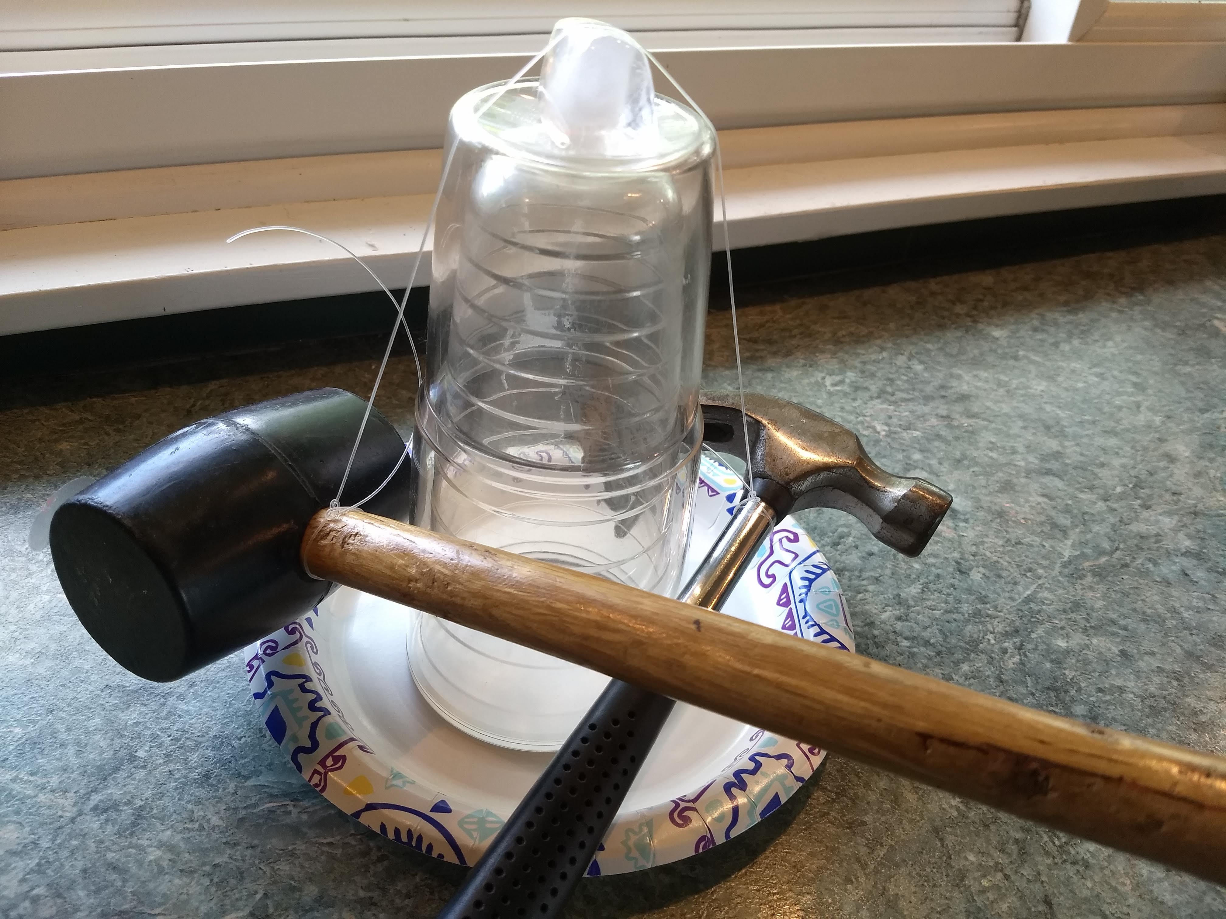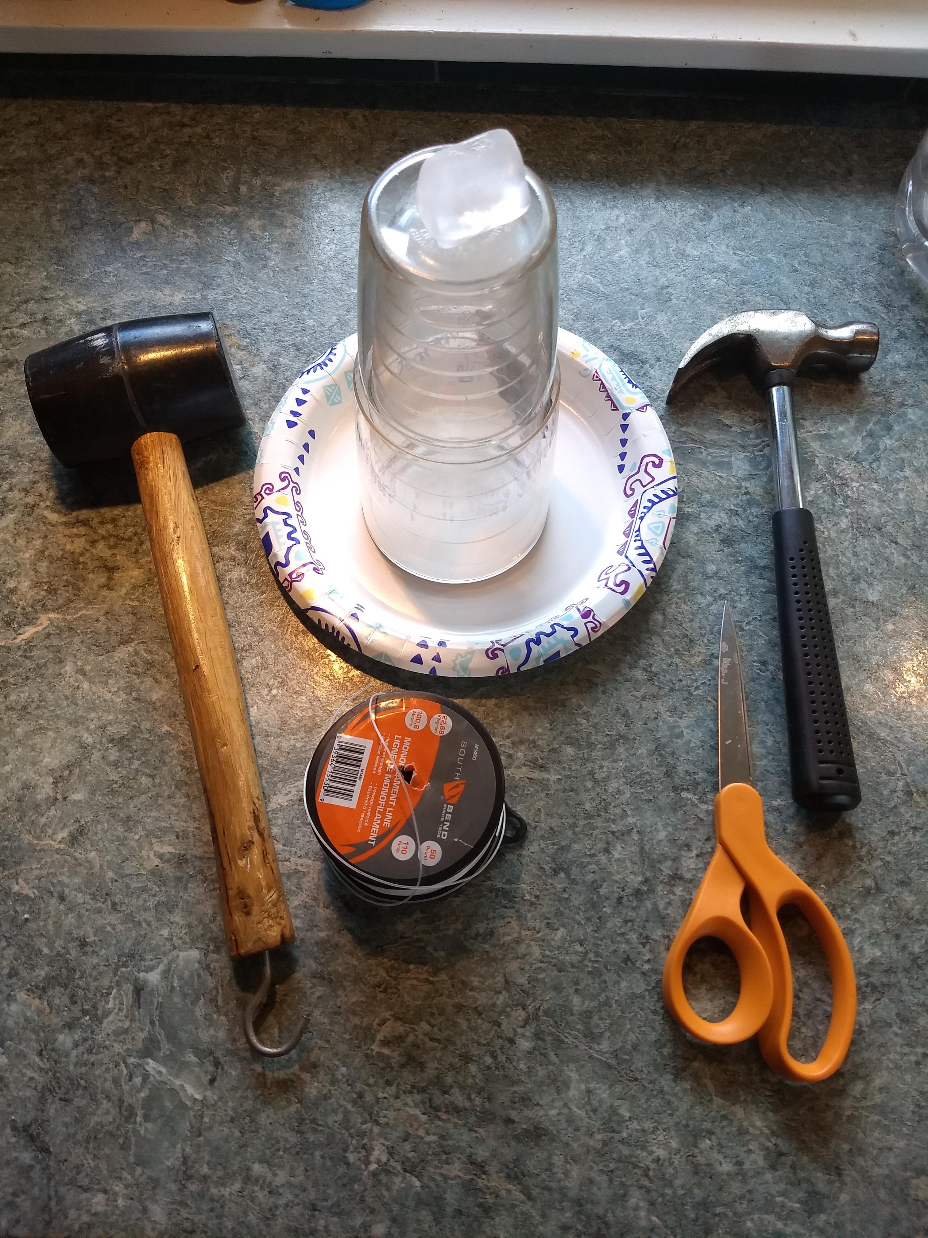 My first run of this experiment didn’t work at all! I first tried a small amount of pressure on the ice, but the line kept sliding off. The second time, I tried heavier pressure, but the ice was melting faster than the line was making any mark; I could hardly see it! So then I tried “sawing” with the hammers, and voilá! I got it to work!You can use large metal kitchen utensils if you don’t have heavy hand tools.