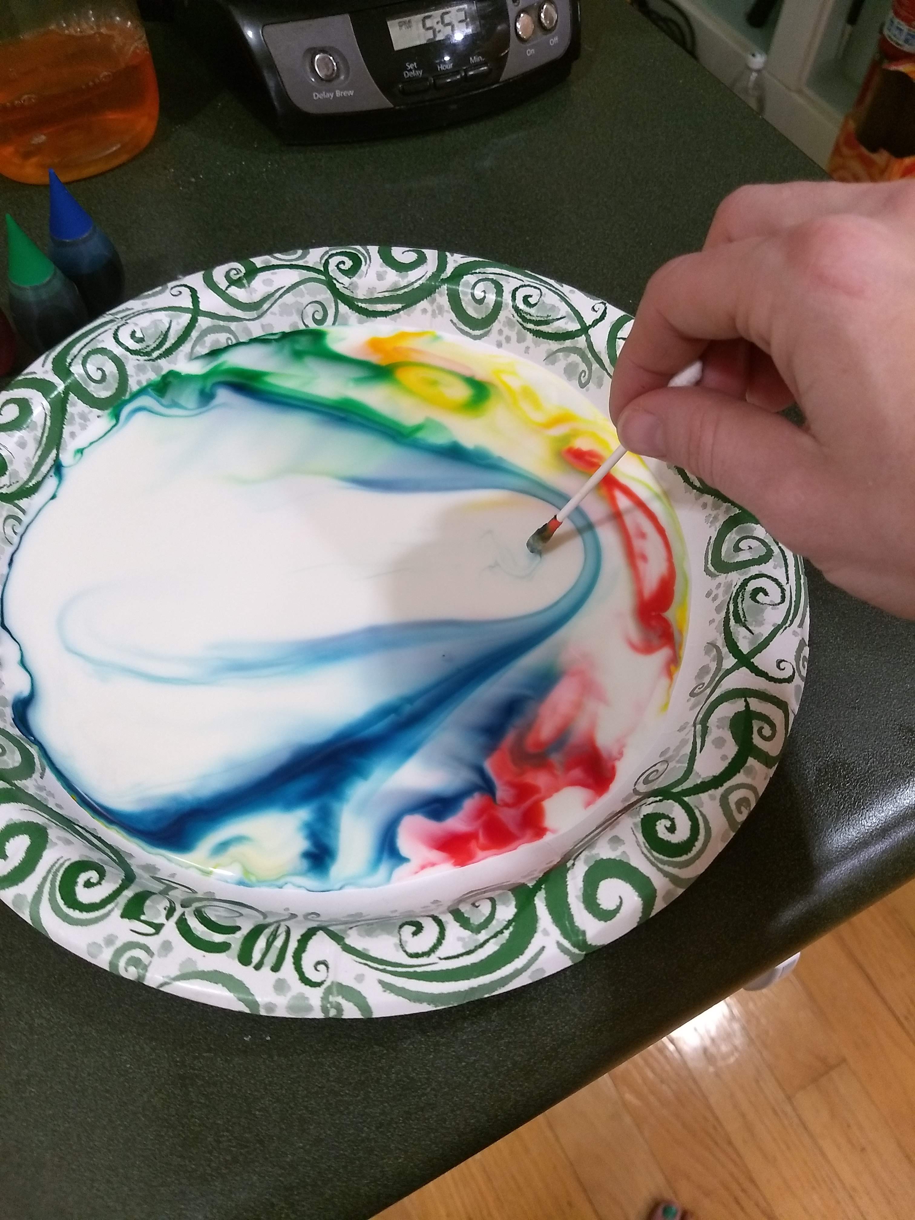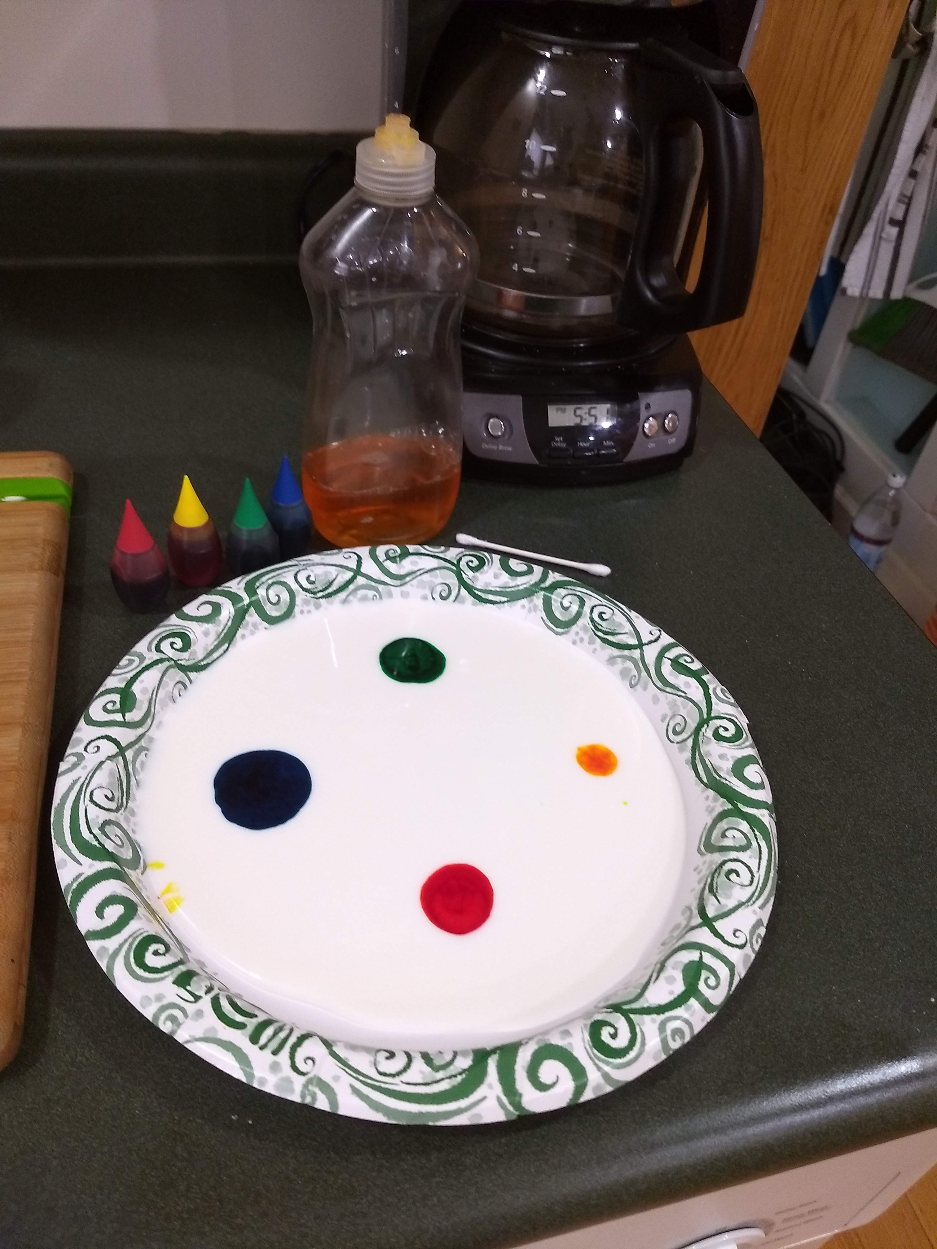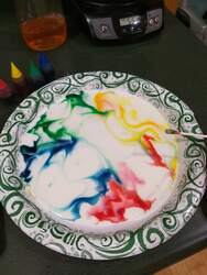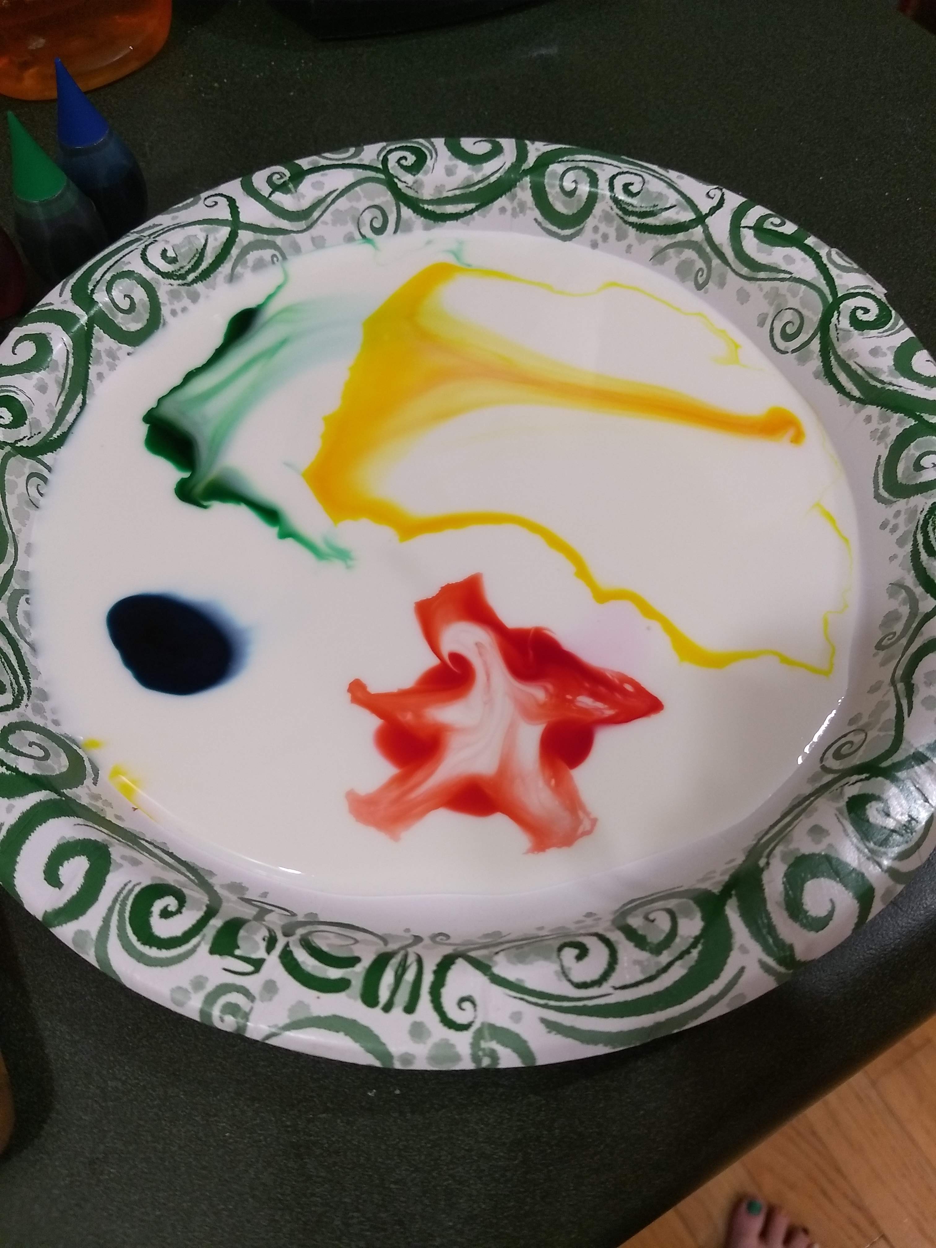 When you added the soap to the milk, the colored milk started spreading all around the plate. The soap breaks down fat molecules and pushes them away from both the soap and water.